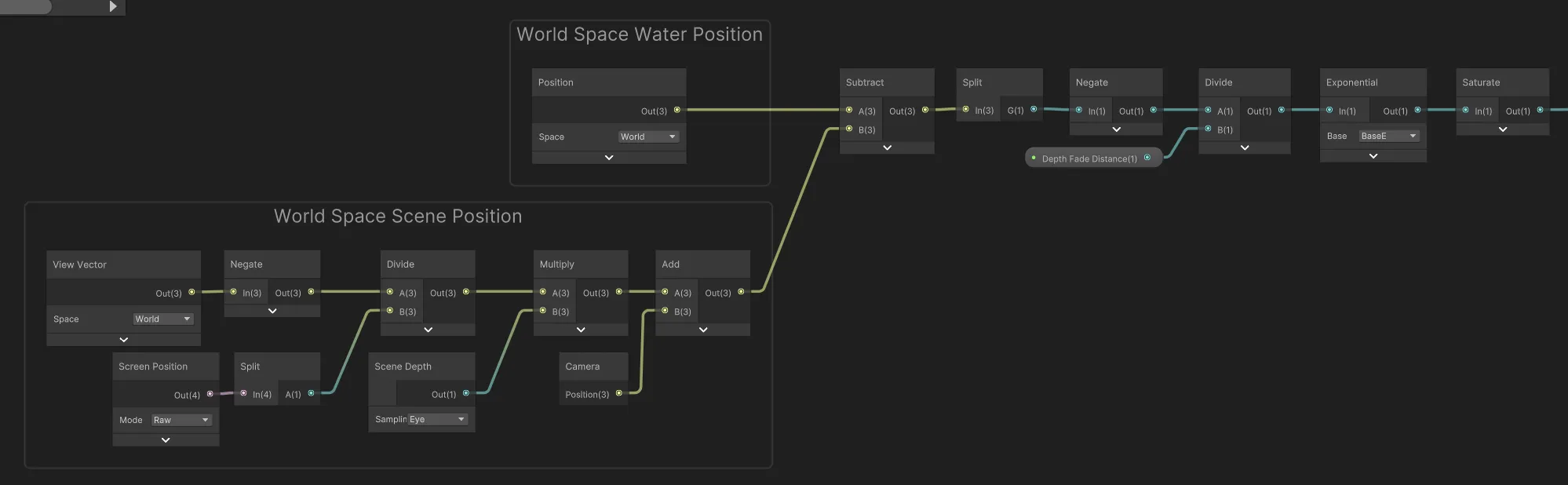解决此问题的一种方法是执行深度检查,判断我们应该使用扭曲的 UV 还是未扭曲的 UVS。Scene Position 子图包含用于计算世界空间场景位置的节点。