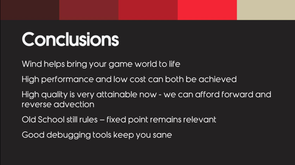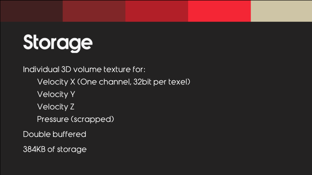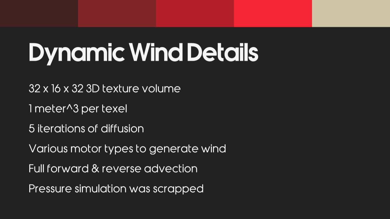 Dynamic WindDetails 对于动态风场,战神开发者用32x16x32 的三维纹理来存,每立方米 一个纹理单位。 为了在GPU上快速方便的模拟风的计算,选择了标准的三维纹理volume,而没有使用层次化的volume。