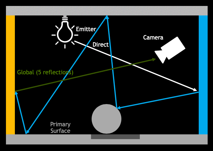 计算直接光照需要先来一发 shadowmap 以获取着色点的光源可见性,对于能够见到光源的点直接带入光照模型即可。而计算间接光照最直观的方法是对每个着色点进行光线追踪,通过向场景发射光线,模拟光线的反弹并记录沿途的信息,我们能够计算着色点所受到的来自整个场景的照明: