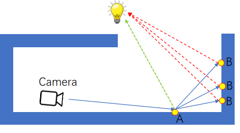 同样的,在实时渲染领域也包含了大量的妥协。既然全局光照中间接光的 N 次反弹我们算不来,那就只计算第一次反弹!一次反弹之后得到的所有 B 点作为间接光源以照亮 A 点: